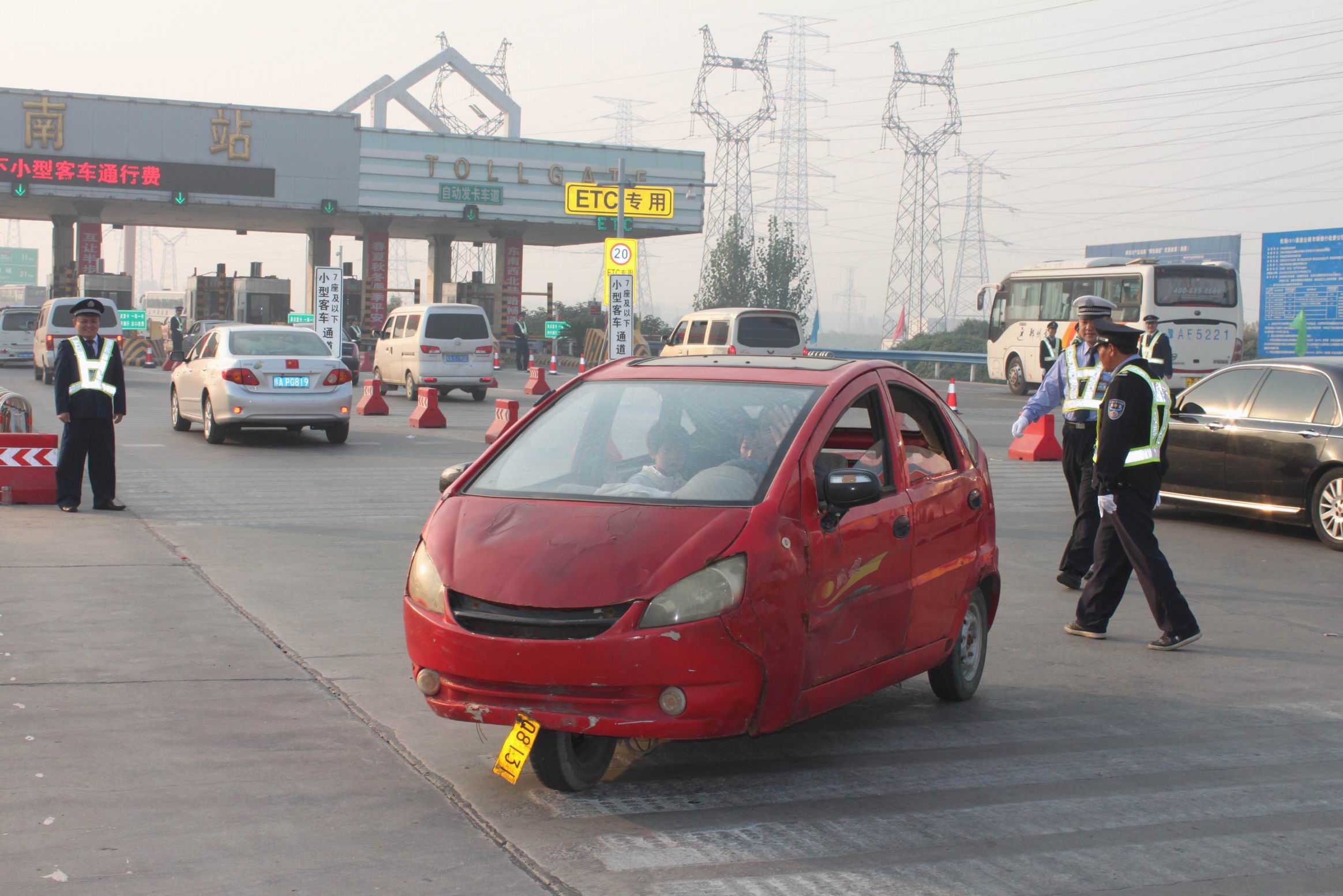 10月1日上午7时55分,在机场高速南站,一辆老人助力车要上高速通行,被执勤民警拦住劝回。