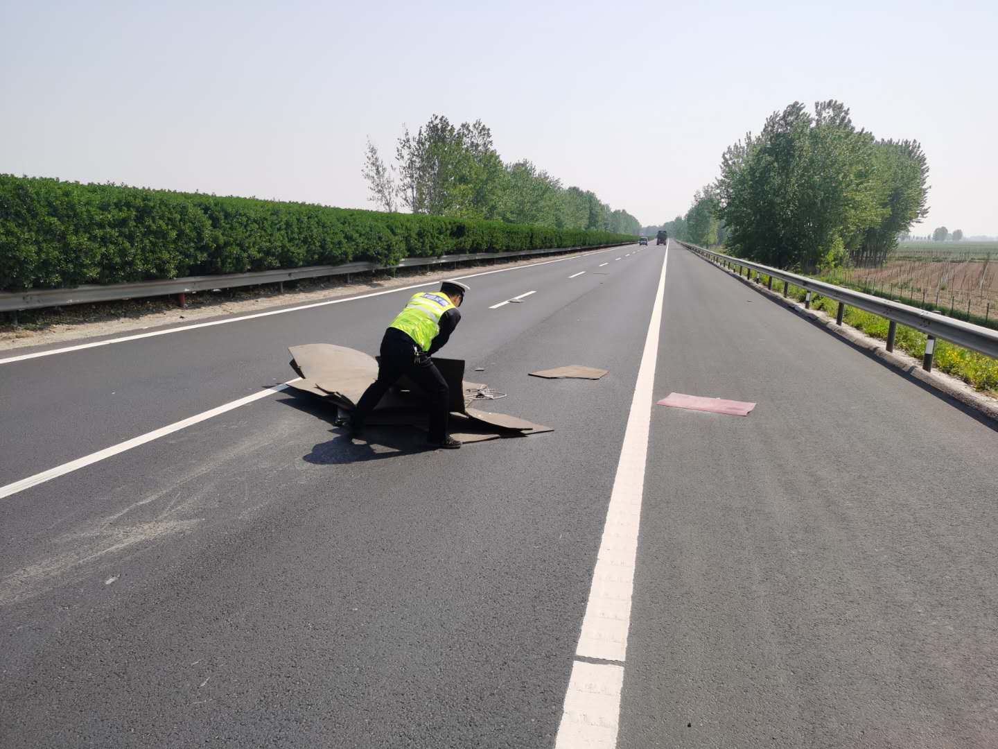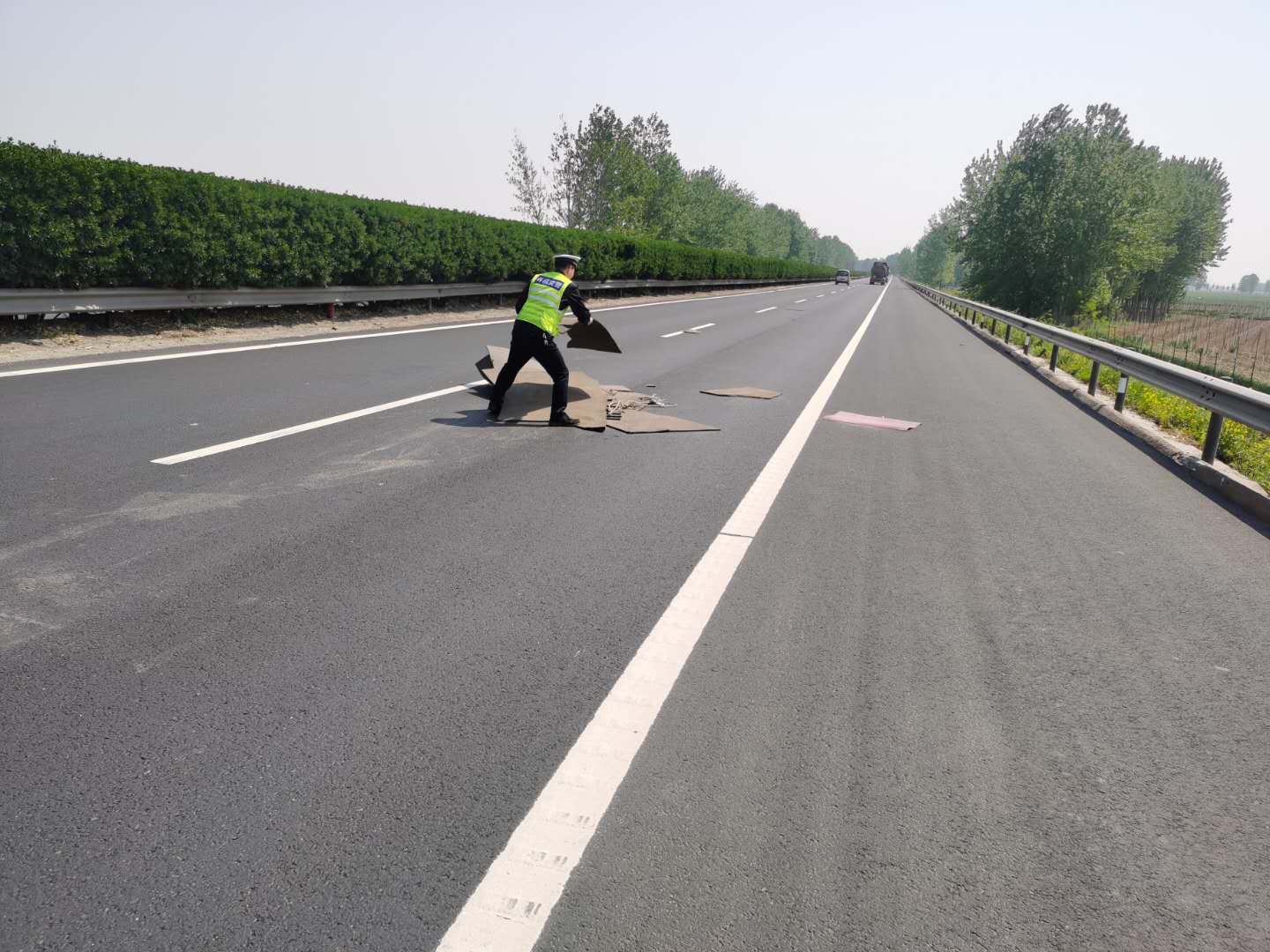 2020年4月22日上午10 时许,许昌市公安局交通管理支队第二高速公路执勤大队民警巡逻至许广高速平顶山至许昌方向13公里处时,发现超车道内有大量海绵垫,过往车辆纷纷紧急转向避让,给交通安全带来极大安全隐患。民警迅速打开警报器提醒后方来车注意提前变道,在确保自身安全的同时,将超车道内的海绵垫拖移至护栏外,电话通知高速公路养护部门清理,及时消除了交通安全隐患。