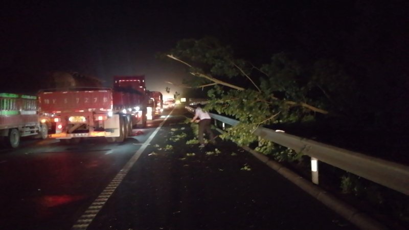 23时10分,大队民警巡逻至盐洛高速695公里处发现有树木被大风刮倒,刮倒的树木占据了整个行车道,此时是深夜,还下着大雨,行车视线非常不好,不时有车辆为躲避倒伏的树木而紧急变道疾驰驶过,存在很大的交通安全隐患。看到情况后,民警迅速下车分为两组,一组人员立即拿出反光锥冒雨设置警示区,指挥车辆提前减速变道,同时通知养护单位迅速携带切割工具赶赴现场;另一组人员和赶到的路政人员一起徒手将树梢处可以折断的树枝折断、搬离,增加车道通行宽度。随后,养护部门赶到,使用切割工具将树木锯断后用车辆移走,经过一个多小时的紧急清理,受阻路段的树木被清除干净,道路恢复畅通。