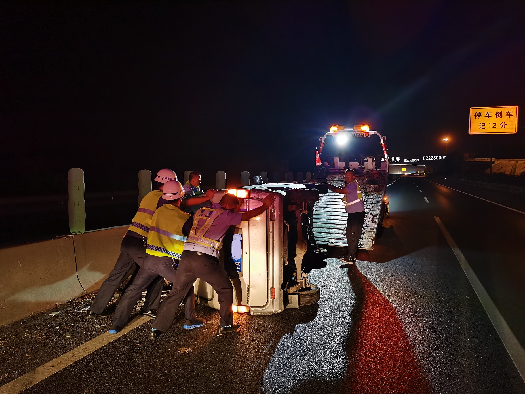 到达事故现场后,民警看到一辆面包车侧翻在超车道,现场未放置任何警示标志,高速车流量过大,车速较快,民警立即在事故现场后方摆设安全锥筒示意来车减速慢行,对车辆进行疏导。经民警现场初步勘察,车辆右后轮爆胎加之司机操作不当是导致事故发生的主要原因,所幸驾驶员和车上人员都无大碍。为了防止二次事故的发生,快速撤离事故现场,现场民警、辅警联合路政人员一起奋力将侧翻车辆扶起推至施救车辆上并及时清理好现场。