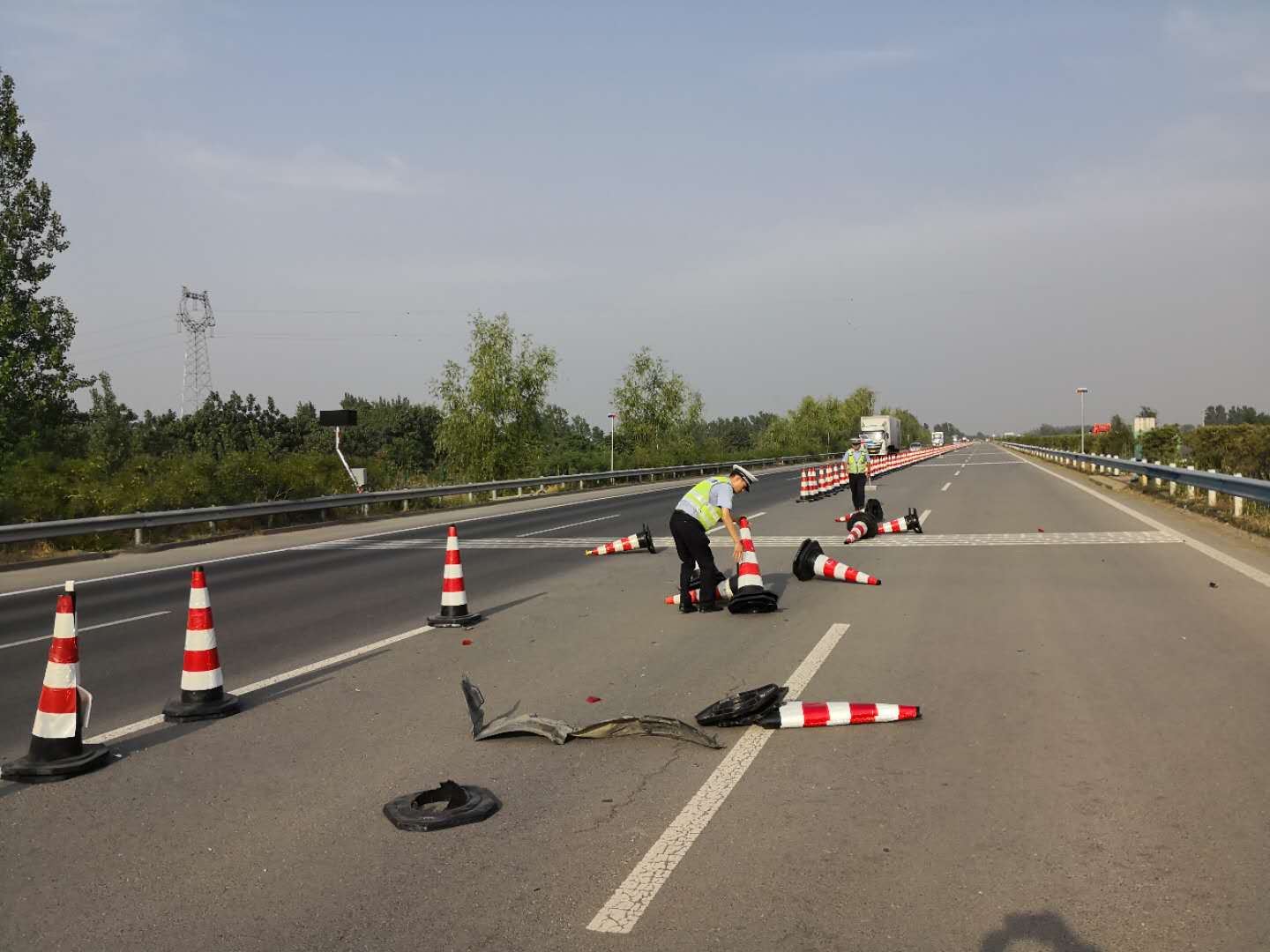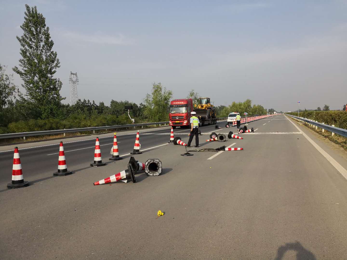 民警立即快速开展现场处置工作。民警首先拉响警笛,示意临近车辆减速向右变道,然后迅速穿梭于多条车道之间,迅速将行车道上的警示标志捡起,摆放整齐,确保过往车辆的顺利通行。我单位值班民警也立即联系施工单位负责人,施工区域内一定要有人员值班,保证路面上出现突发情况时能够及时快速的处置,确保施工区域的安全。