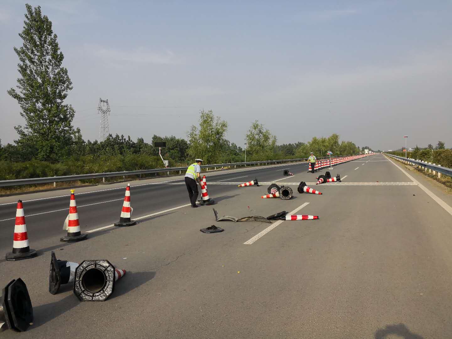 6月4日上午,开封高速支队省界大队值班民警巡逻至连霍高速476公里处时,发现行车道上的施工安全警示标志有的已经倒在了行车道上,导致过往车辆有的突然变道躲闪、有的忽然降速、有的躲闪不及干脆从上面碾过去,存在较大的安全隐患。