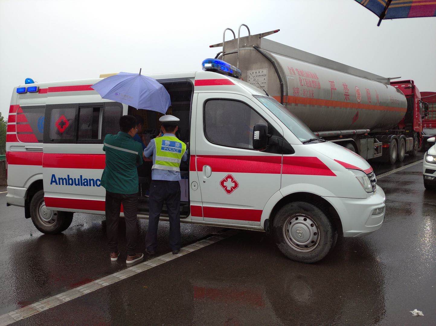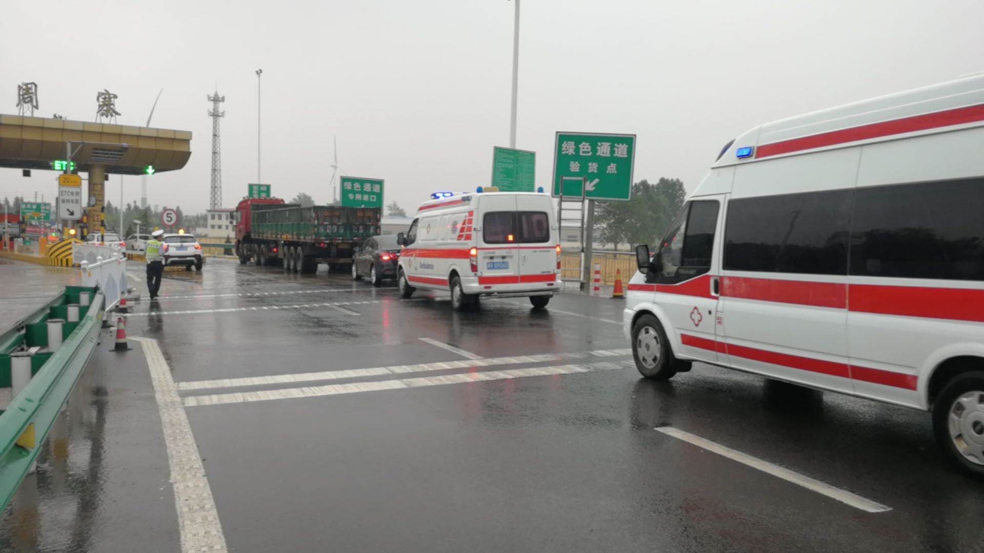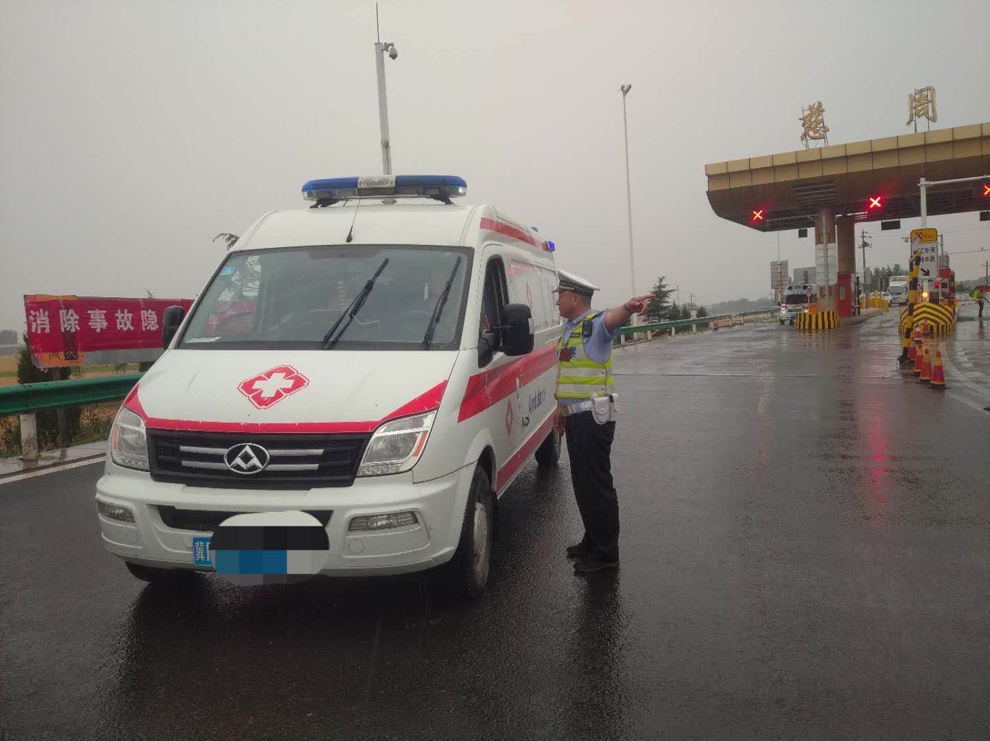 当天下午16时许,大广高速滑县段相邻辖区高速发生一起交通事故,车辆拥堵至大队所管辖区内,一大队全体民辅警冒雨上路进行保通疏导。此时过来两辆救护车,车内人员均称车上有危重病人,路上不能耽误太久,需尽快送往医院救治,现需要高速交警同志帮忙。此时大广高速北向南方向的路因为事故还没有疏通,想要继续往南走只能逆行将救护车送下站让其从普通公路走。民警核实车内情况属实后,通过与救护车上的医护人员及驾驶员沟通,当即决定用警车逆行带道的方式从应急车道将两辆救护车送下慈周寨收费站。高速应急车道逆行10公里后民警将救护车安全送下站,随后民警告知了驾驶员从普通公路往南方向走的线路,待两辆救护车安全离开,民警又带上辅警继续上路开展道路安全保通工作。