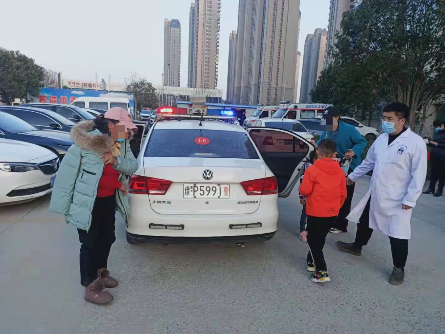 正值下午六点左右,城区区域道路车流量较大。情况紧急,淮阳中队三名交警二话没说,立即驱警车在前开道带路,警报响起,警车速变急救前导车,同时1名交警及时拨打120急救中心获取最近的医院急诊电话并及时与急诊室取得联系,说明情况后请对方立即做好救治准备。