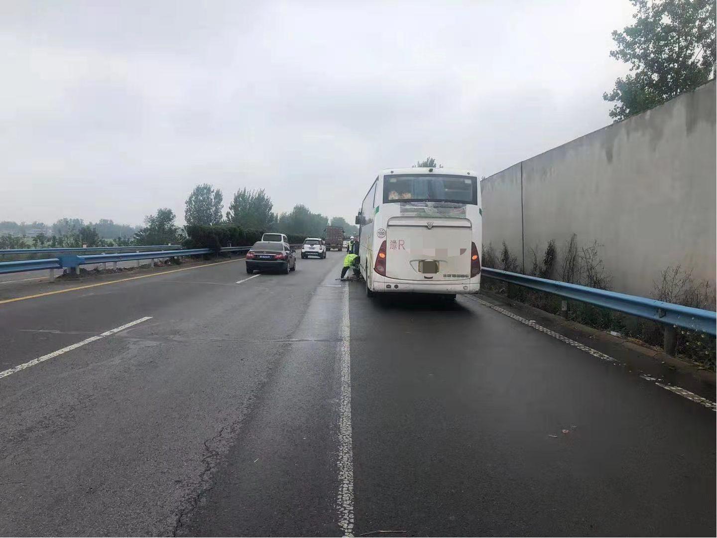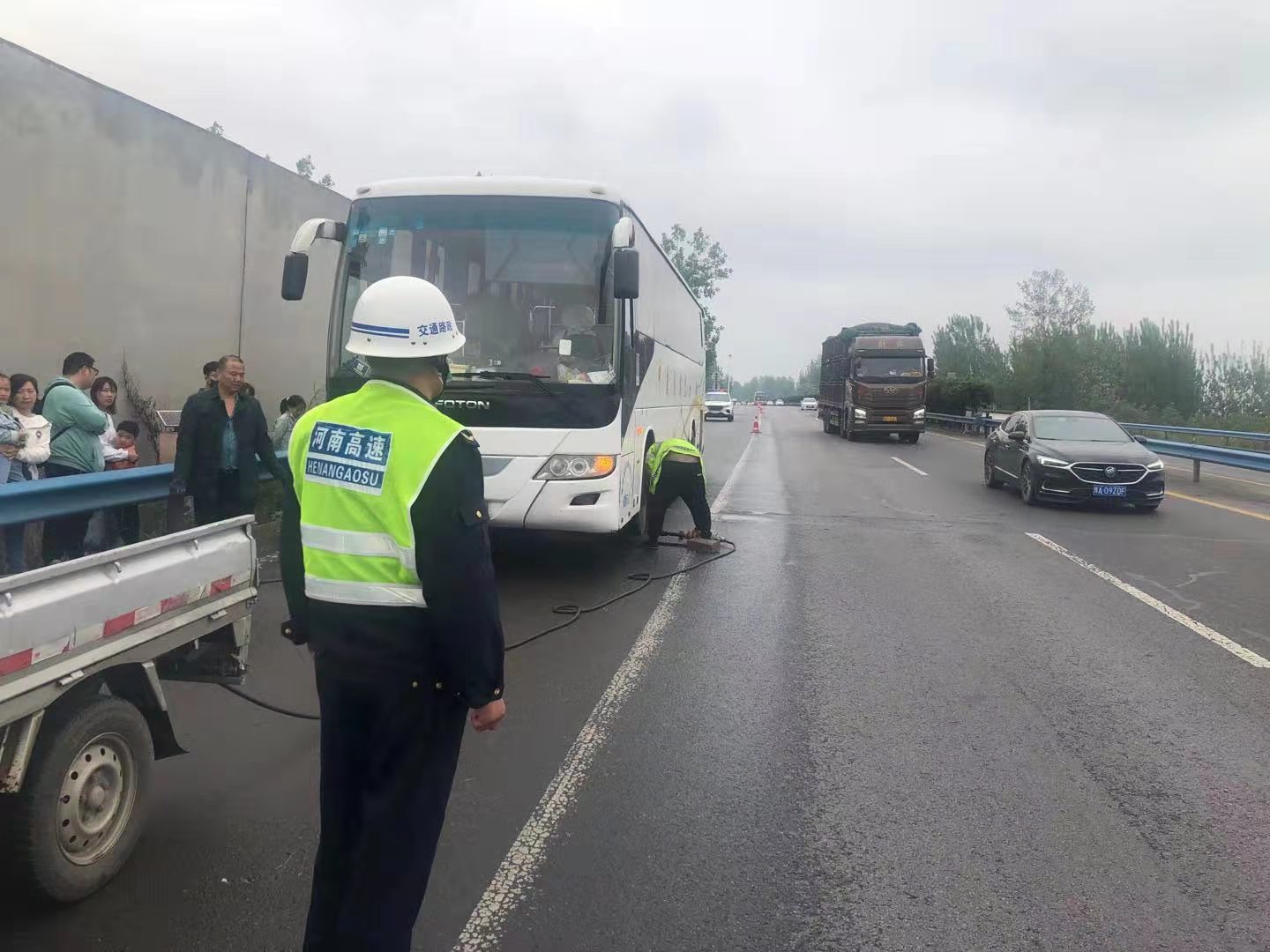 2021年5月3日16时03分开封市高速交警支队一大队巡逻至兰南高速52公里处北向南,发现一辆大客车停在应急道无法行驶,现场十分危险,巡逻民警、辅警立即停下巡逻警车上前了解情况,得知原因是客车左前轮爆胎导致无法行驶后,立刻组织车上乘客下车站在护栏外,摆放警示标志,并联系救援车帮忙更换轮胎。同时指挥过往车辆有序通行,及时消除安全隐患。