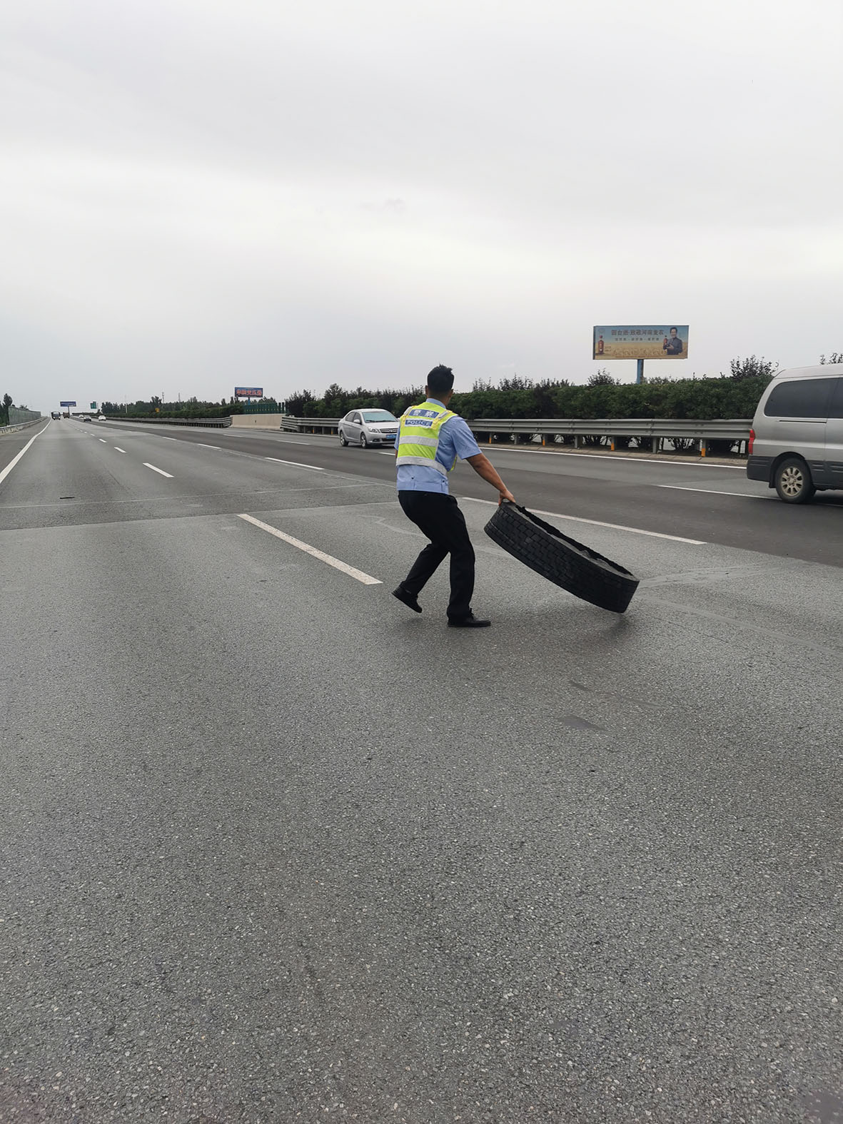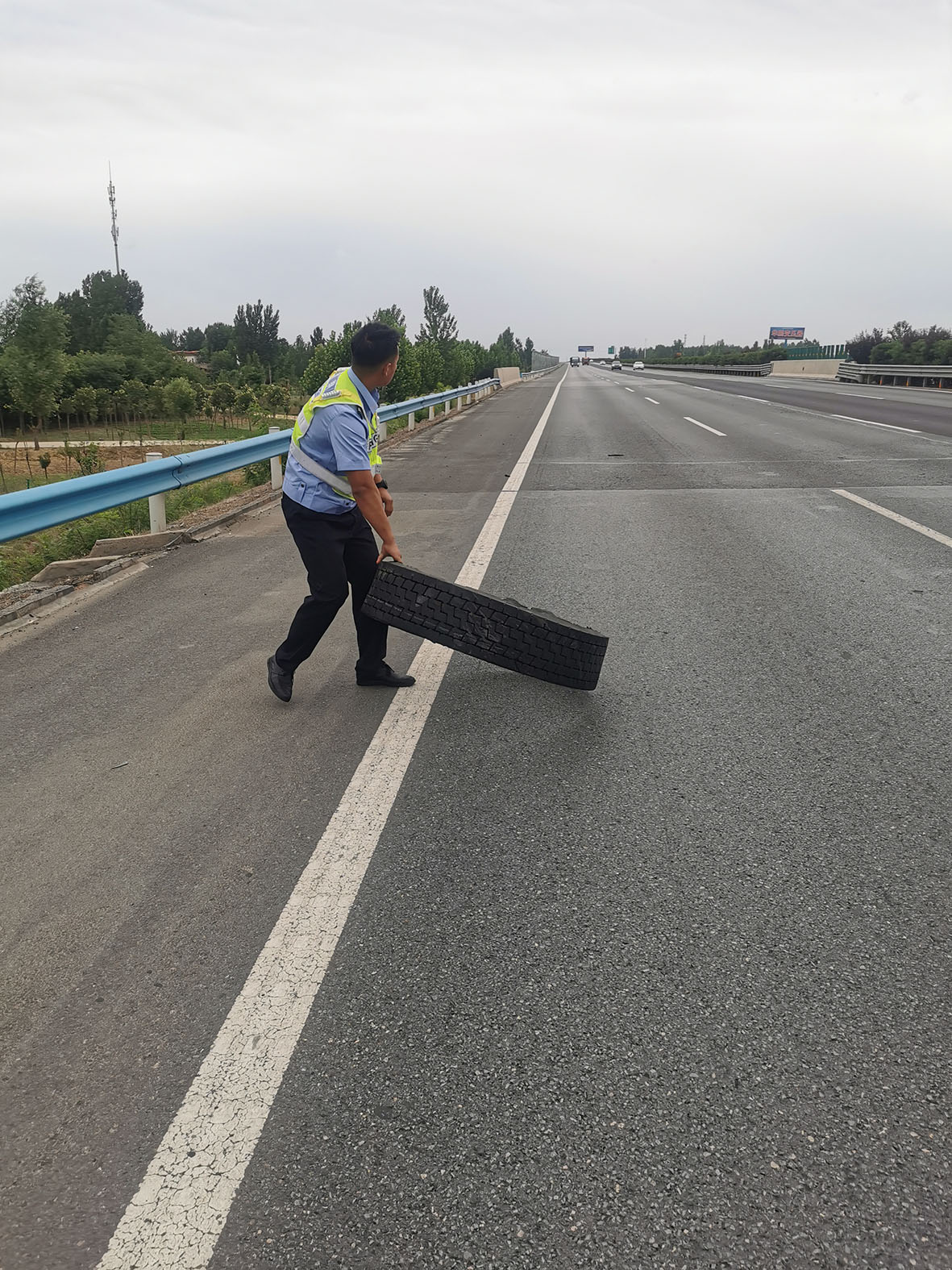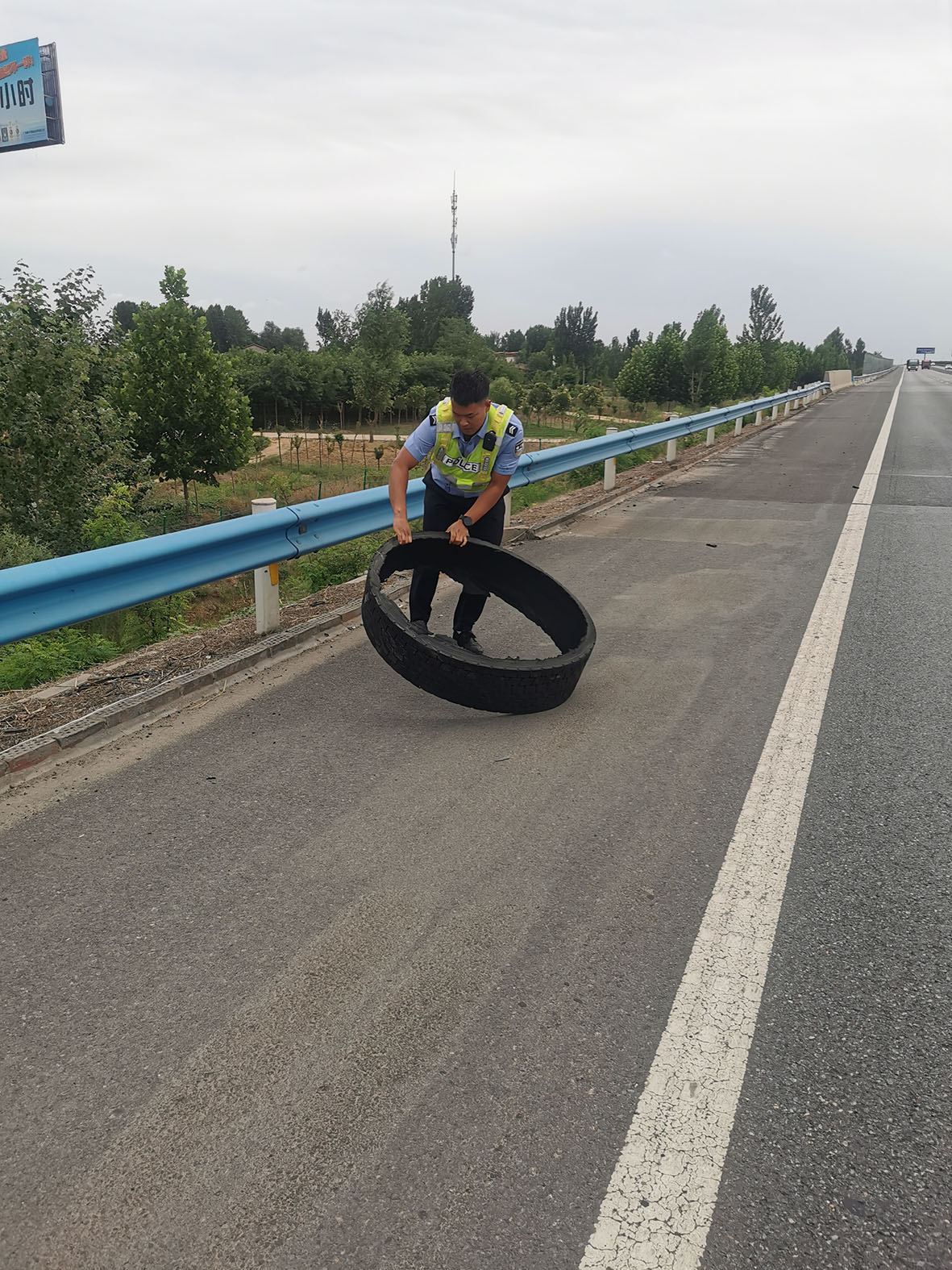 6月17日下午3时,开封高速交警支队接到报警称在连霍高速487公里处有块废弃轮胎遗落在道路上,严重影响通行并存在安全隐患,接到报警后民警迅速赶往现场,做好现场安全警戒。在确保安全的情况下,迅速跑上前去,将遗落物拖出路面,使路面恢复了干净整洁,及时消除道路安全隐患,确保了道路安全畅通。