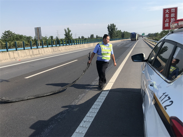 6月21日下午16时左右,开封高速支队执勤民、辅警在辖区大广高速巡逻时,发现道路前方有一破烂的轮胎皮掉落在路面上,对过往车辆的行驶造成了安全隐患。随即,巡逻辅警迅速清理了掉落在高速公路上的破烂轮胎皮,及时消除安全隐患,为道路安全畅通提供了强力保障。清除路面障碍物,营造了畅、安、适、美的行车环境,有力地保障了广大司乘人员的行车安全。