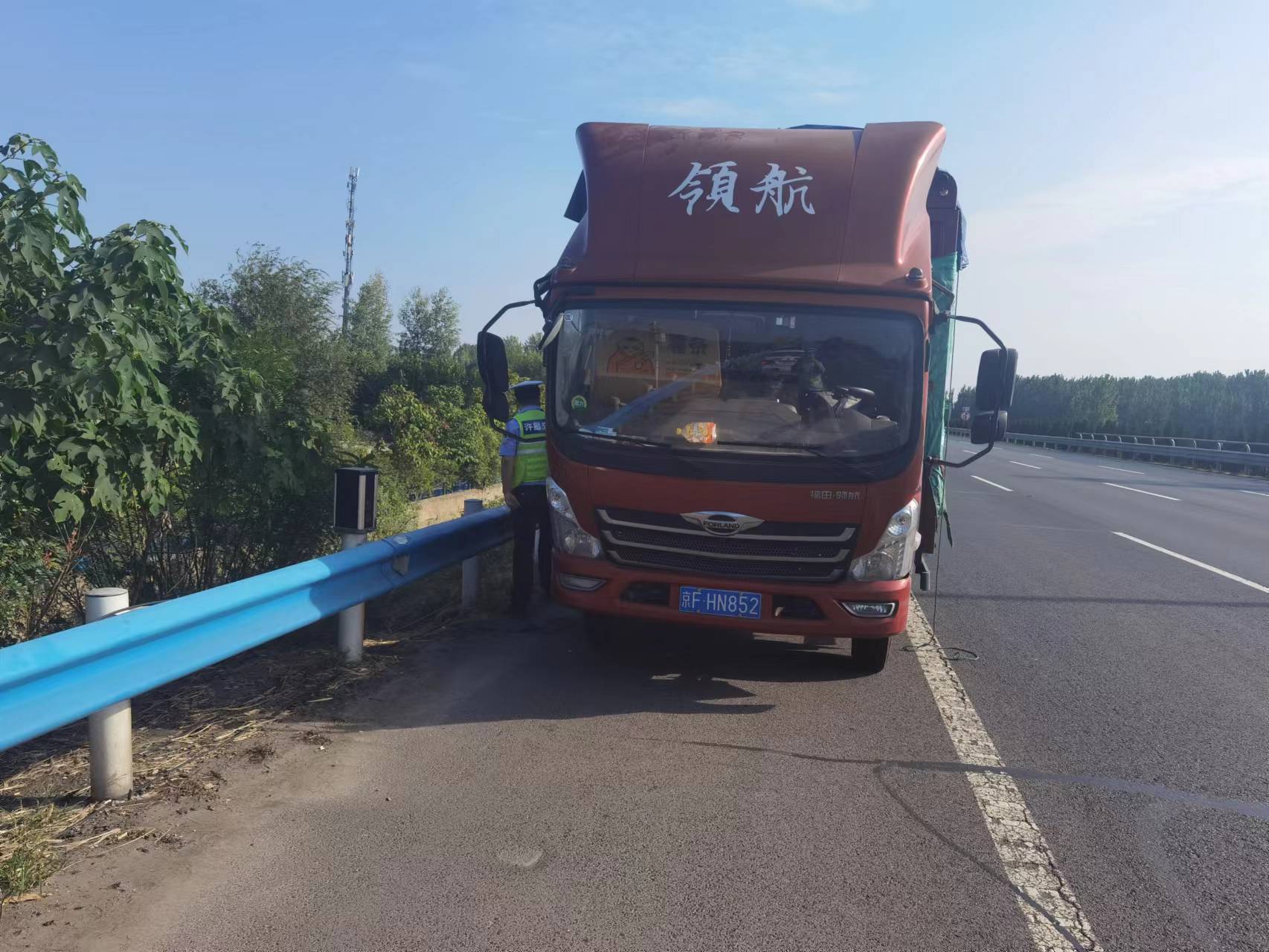 2022年9月18日星期日下午16点25分许,许昌市公安局交通管理支队第一高速公路执勤大队民警在辖区京港澳高速巡逻,巡至747公里处时,发现一辆大货车货物倾斜,停在应急车道上,后方未放置安全标识,存在极大的安全隐患。