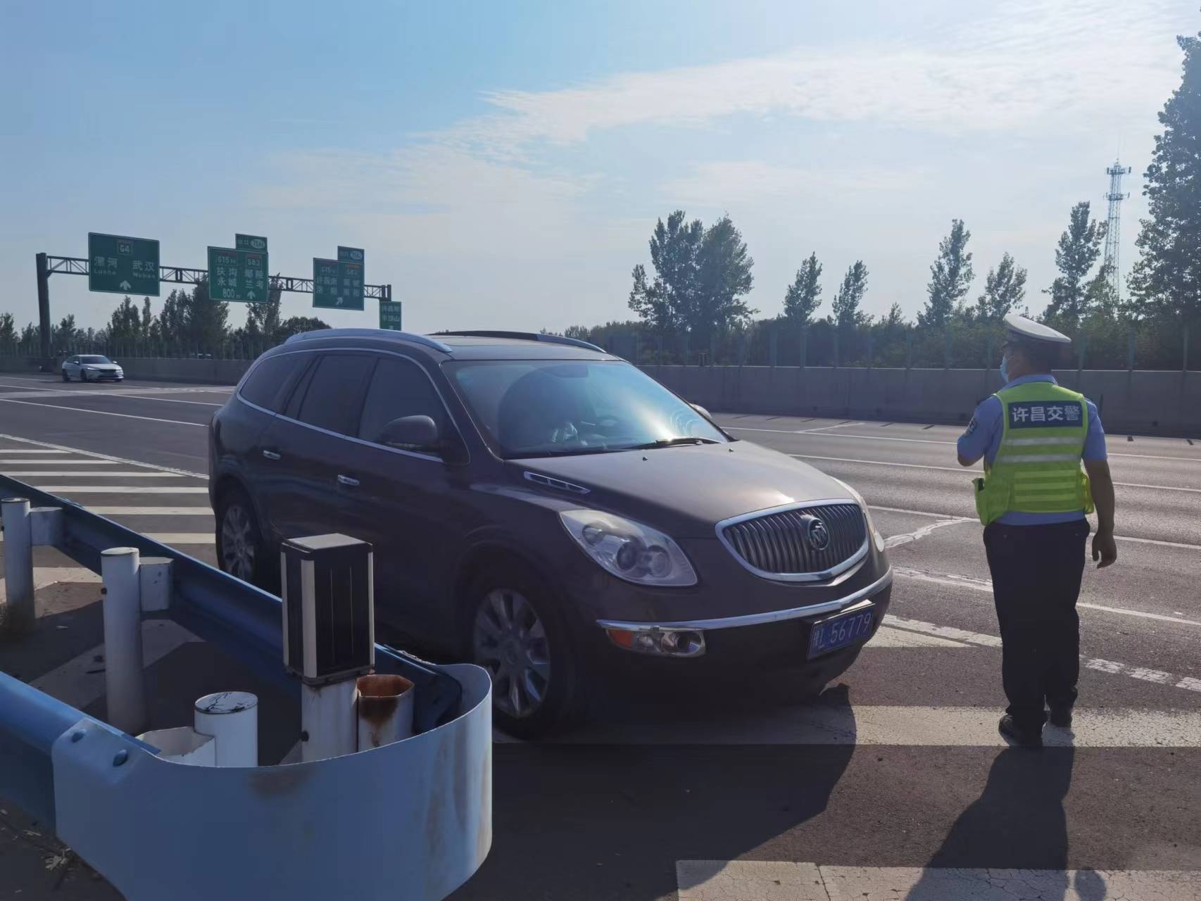 2022年9月18日星期日下午,许昌市公安局交通管理支队第一高速公路执勤大队民警巡逻途中,发现一辆小型SUV停在应急车道上,民警立即靠边停车,并靠近车辆进行安全检查。