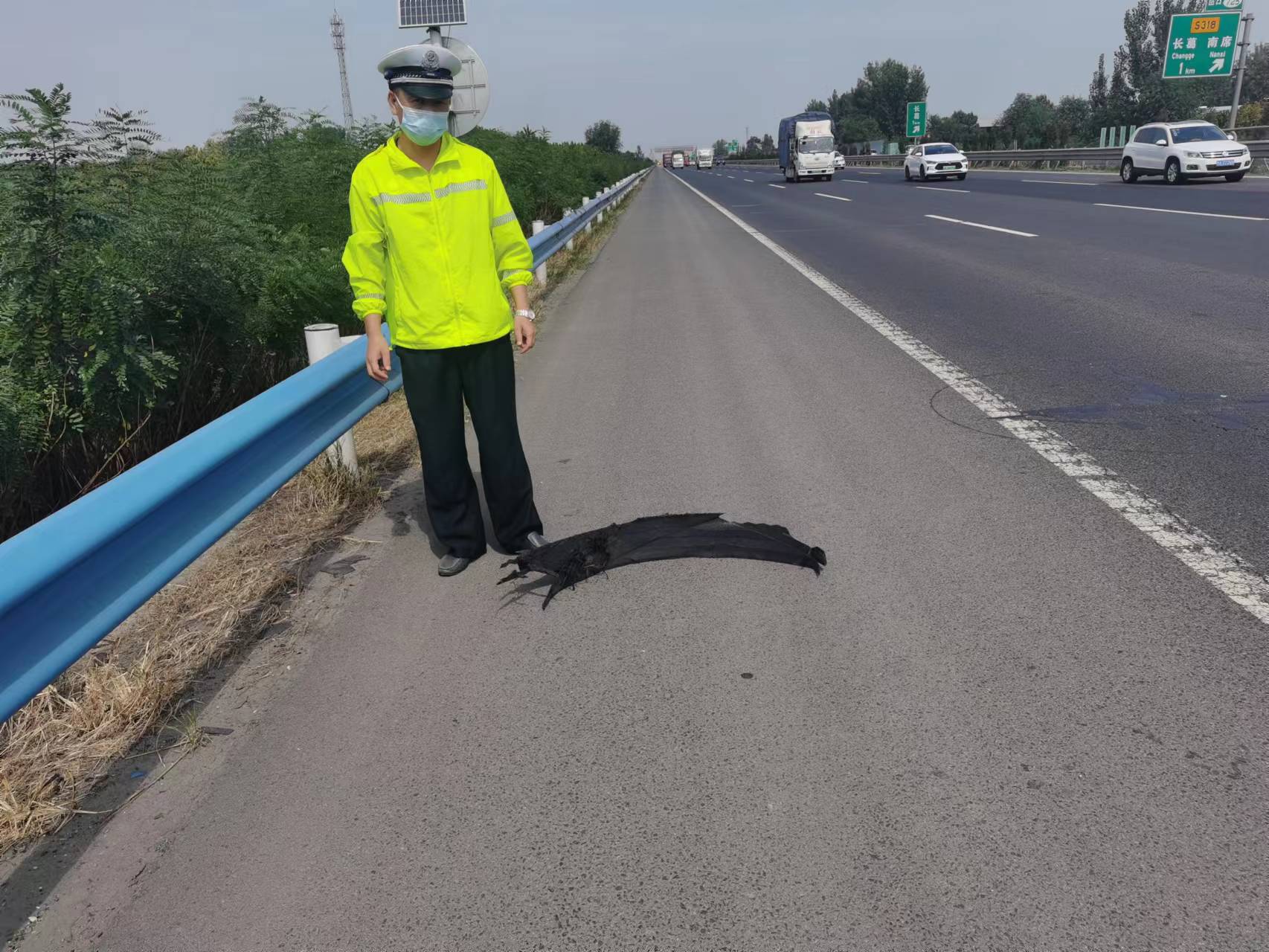经查看,该障碍物为货车轮胎皮,对路面行车构成严重威胁,民警第一时间将该废轮胎清理出高速公路,及时消除一起事故隐患。
