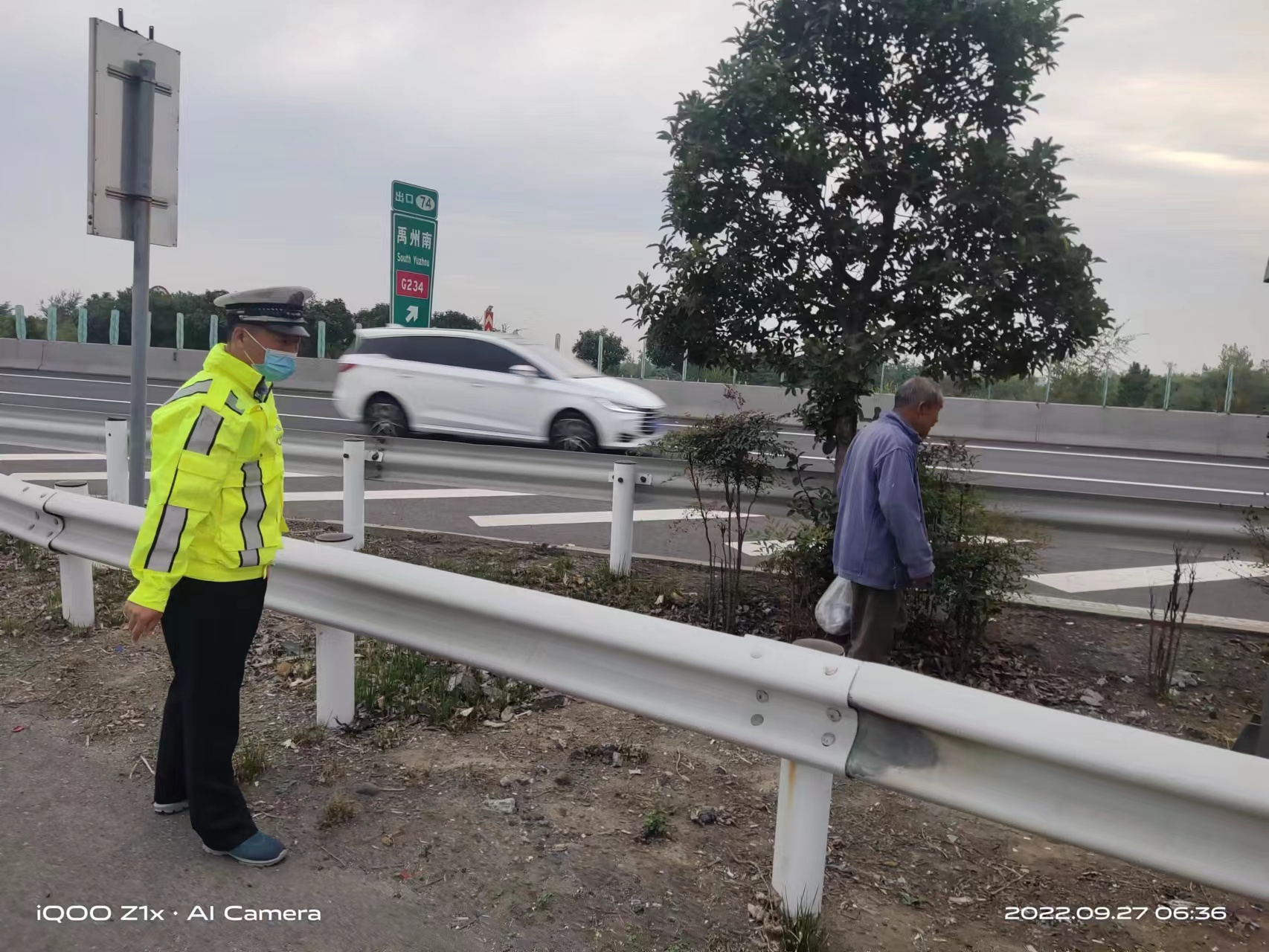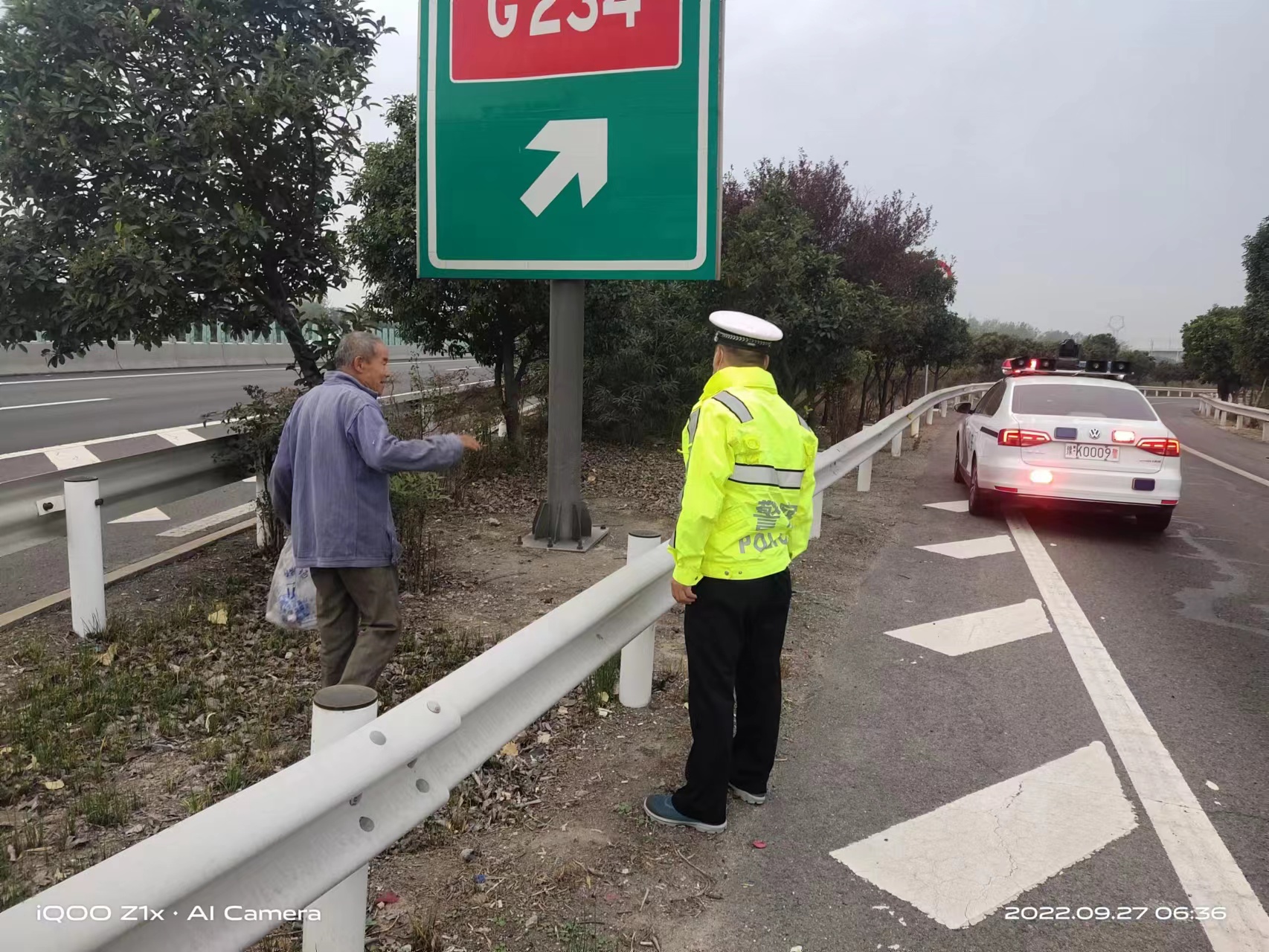 2022年9月30日上午许,许昌市公安局交通管理支队第三高速公路执勤大队民警巡逻至郑栾高速禹州南服务区时,发现有一老年人在高速上行走,经询问得知老人想到高速东边田地收秋,走高速距离近,民警吿知他行人上高速的危害及对自身安全不利,民警劝导他离开高速。