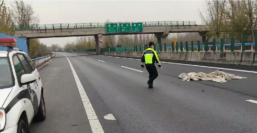 开封高速交警提醒广大驾驶员,在车辆高速行驶过程中,车辆掉落的任何物品都可能对本车及后方车辆产生很大的影响,为了大家的安全,驾驶员要注意车辆所载货物,出发前和休息时都要检查车辆附属物品是否捆绑好,避免物品滑落后引发交通事故;高速公路上行驶过程中,发现前方出现障碍物,一定要保持冷静,不要慌乱、紧张,不要猛打方向或猛踩刹车,防止紧急避险超过必要限度。把握好手里的方向盘,安全减速慢行,并及时向高速交警、路政等部门报警处置。