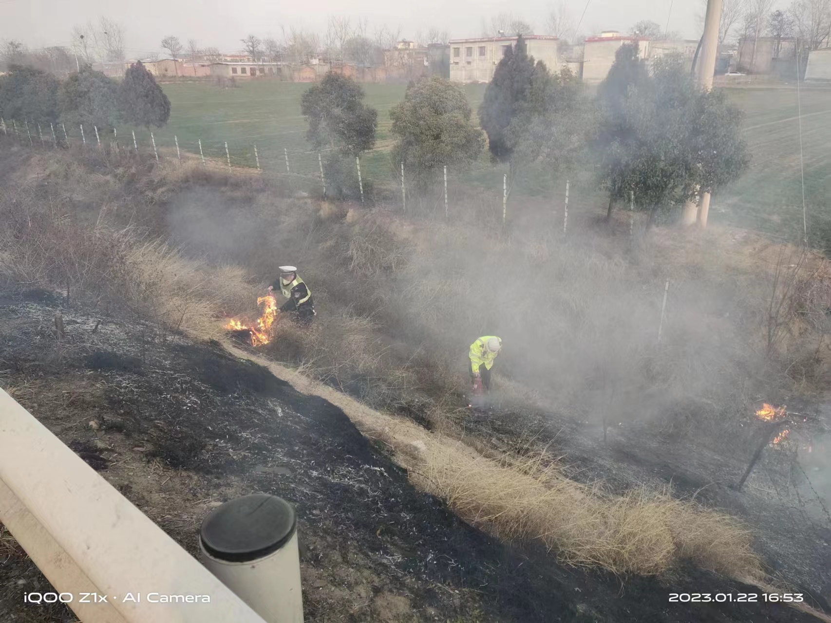 1月22日下午,许昌市公安局交通管理支队第三高速公路执勤大队民警巡逻到郑栾高速时,发现高速公路边坡起火,燃烧形成的浓烟随风飘向高速公路,可能导致过往司机视线受到影响,直接威胁到高速公路行驶车辆的安全。而且今年冬季天气干燥,明火周围全是树木干草,明火引燃的面积越来越大。若不能及时灭火,后果不堪设想。执勤民警立即通知辖区路政部门。