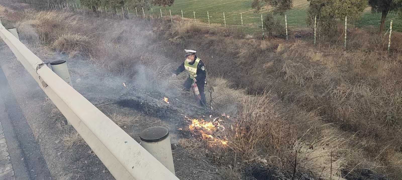随后执勤民警立即指挥车辆靠边停车,安排人员对现场进行安全警戒,开启警报器,在来车方向200米外进行警示提醒,引导通行车辆减速行驶,安全通行。同时安排人员近距离查看起火点,发现是边坡枯草被点燃,巡逻人员和赶来的路政队员合力将火及时扑灭,消除了安全隐患。