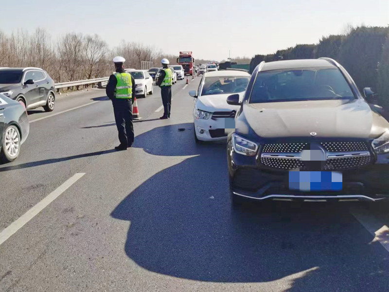 事故现场一片狼藉,地上有大量车辆散落物,两辆事故车辆一前一后停在高速公路第一车道,仅有第二车道可以勉强通行,该时段车流量相对较大,如不及时清理现场,极易引发道路拥堵和二次交通事故。民警立即拉响警报警车后方警戒,快速取出车载反光锥筒后方设置安全区,并指挥车辆从第二车道依次通行。事故现场勘查取证结束后,民警再次协助现场工作人员清理路面,道路快速恢复正常通行。