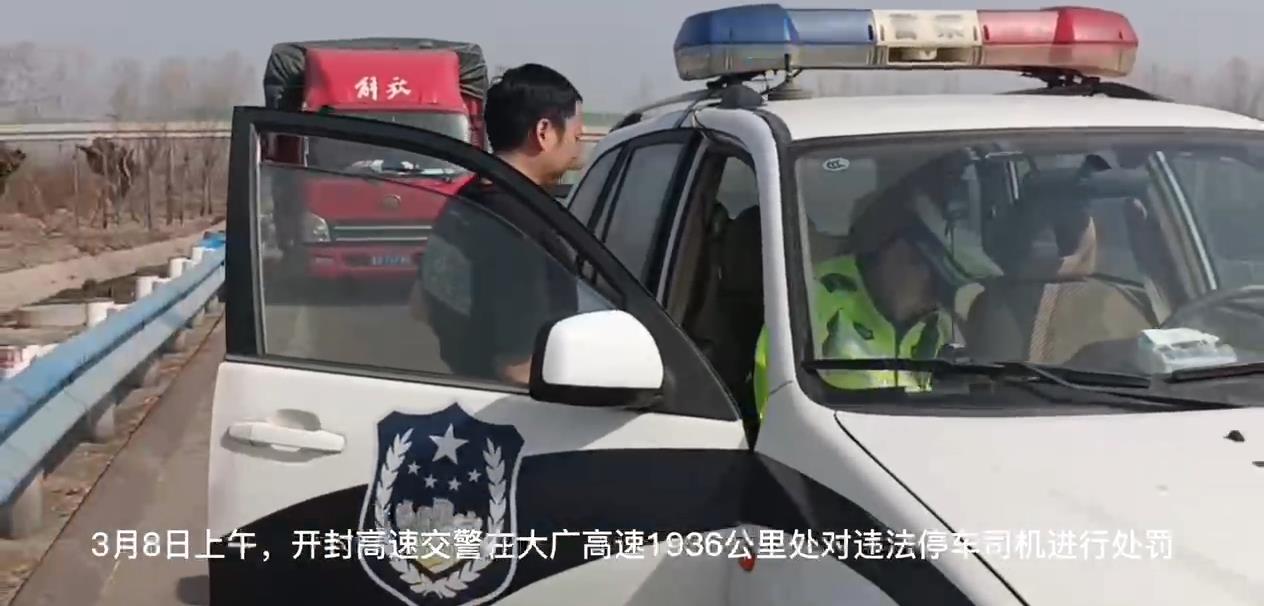 2023年3月8日上午,开封高速交警支队一大队大队长朱刚带领辅警李成龙、赵超群巡逻至大广高速1936公里处时,发现一辆货车停在应急停车岛内,未按要求开启双闪灯,也未摆放三角牌。于是民警立即在车后方做好安全防护措施后,到达车旁查看,发现驾驶员正在驾驶室内玩手机,民警立即对驾驶员的行为进行制止,并把司机带到安全区域,询问情况。