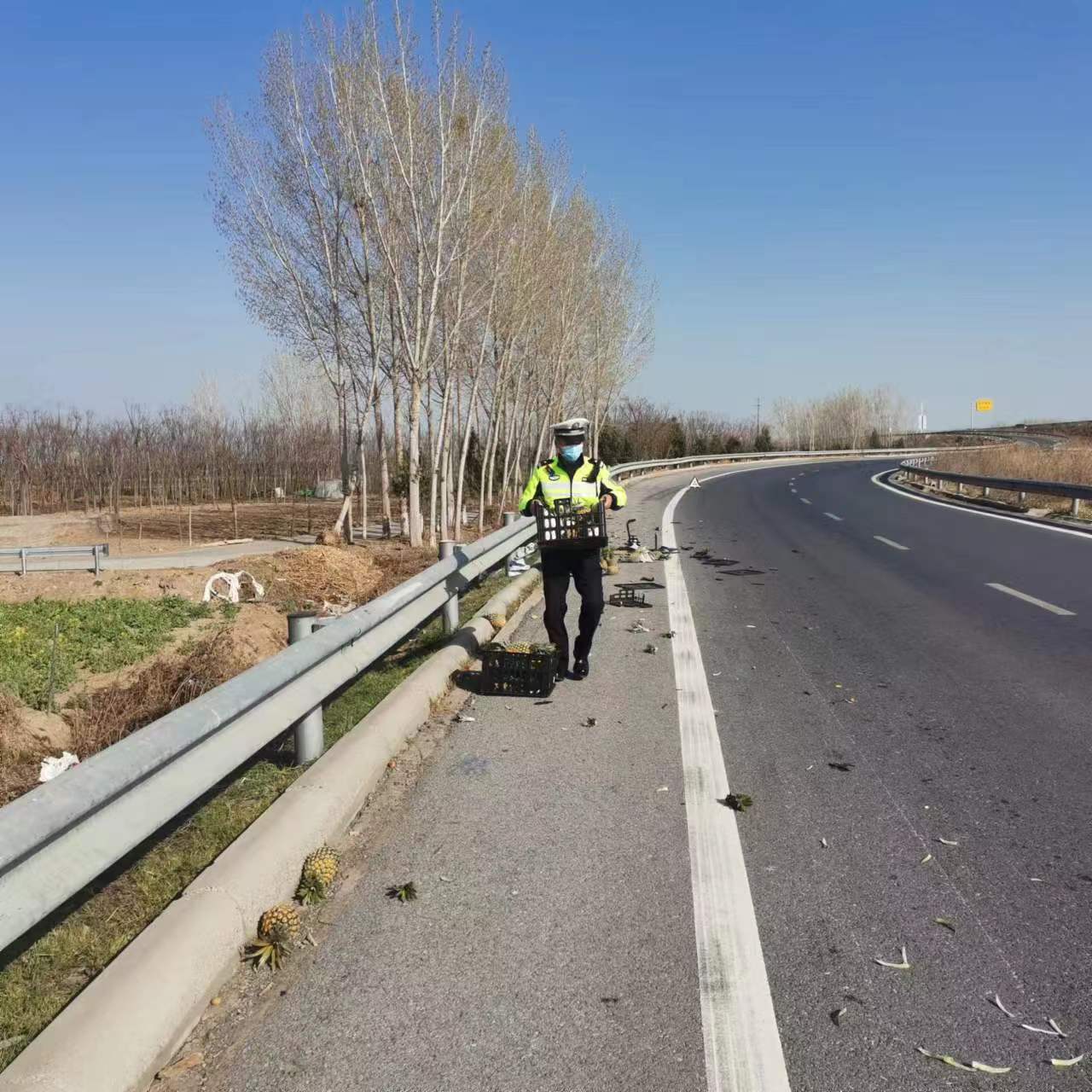 为了避免事故发生,二大队民警赵虎立即将车停在应急车道,车后放上警示锥桶,打开双闪,拉响警报,上前查看发现货车司机十分懊恼的看着散落一地的菠萝。了解情况后,民警赵虎立即利用车辆行车间隙,带领辅警迅速将散落物品清理,将货车司机的货物整理一下,搬运至货车上,保障了高速公路交通安全通行。过往司机看到开封高速交警这种行为纷纷鸣笛表示感谢。清理路边掉落路障举动虽小,但能有效预防避免事故的发生,开封高速交警支队二大队所有人员时刻保持高效快速的出警速度,保障高速公路交通安全通行。
