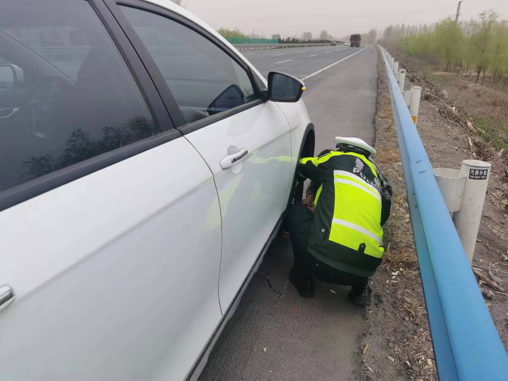 为排除险情,巡逻交警为故障车辆按照规范摆放好反光锥筒,设置安全警示标志,将车辆随行人员疏导到护栏外,指挥过往车辆避让,并帮助司机迅速换上备用轮胎,等待备用轮胎完成后便撤离现场。