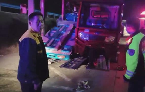 2023年4月8日22时许,开封高速交警支队一大队民警朱勇接到指挥中心报警称一辆货车在行驶途中,车上装载的一辆红色三轮车掉落至兰南高速10公里左右处,事发深夜,物品较大,高速上车速快,十分危险,民警朱勇立即联系施救单位并带领辅警李振民、韩俊峰、宋鹏杰前往掉落地点。民警到达后发现一辆红色三轮车停在应急车道与行车道之间。过往车辆纷纷避让,存在极大安全隐患,民警立即在后方做好安全防护措施,打开警车警灯警报,迅速联合救援单位,将车辆拖至陈留停车区,将车辆交还失主并对其进行批评教育。事后经了解,该车辆从山东前往湖北襄阳,由于对货物捆扎不牢固,发生掉落,旁边经过的车辆不断向他示意,驾驶员并未在意,继续开车行驶至开封陈留停车区才停车检查,结果发现车尾最后一辆三轮车不见了随即报警求助。