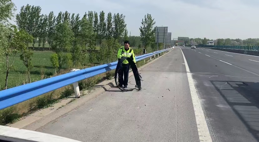 2023年4月15日9时29分,开封高速交警支队二大队民警赵虎带领辅警巡逻至大广高速1930公里处,发现前方行车车道有一掉落物,为大货车轮胎爆胎后产生的胎皮,胎皮较大较重,在高速公路上十分危险,现场途经车辆纷纷紧急刹车或变道,极易发生碰撞或追尾事故。为尽快消除隐患,民警马上靠边停车,响起警报,迅速清理轮胎皮碎块。