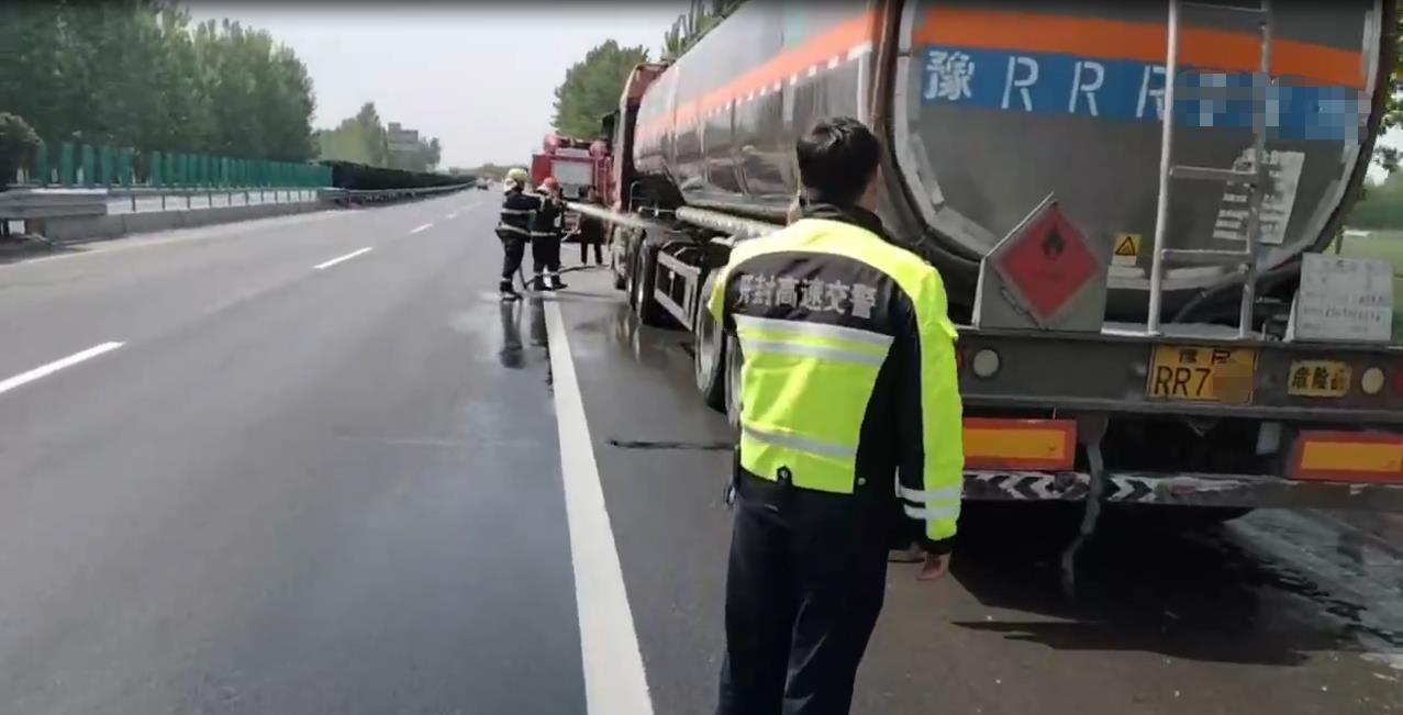 2023年4月16日,开封高速交警支队一大队民警朱勇接指挥中心报警称在兰南高速62公里处,有一辆危险品车的轮胎突然冒烟,情况紧急,民警立即联系该驾驶员让其先用自带灭火器对轮胎进行降温灭火,又立即联系消防单位,并带领辅警李振民,韩俊峰,宋鹏杰前往现场,到达现场后,民警打开警灯警笛,在车辆后方做好安全防护工作,联合消防队对车辆轮胎进行浇水降温,在众人齐心协力下,起烟点被扑灭。