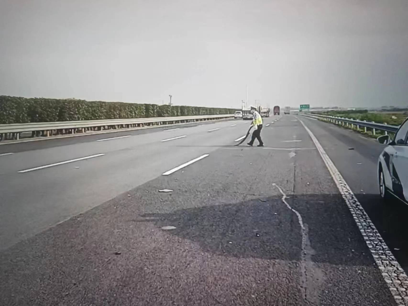 经查看,该障碍物为车辆轮胎皮,对路面行车构成严重威胁,因当天车流量较大,巡逻交警迅速将该物品清理出高速公路,及时消除一起事故隐患。