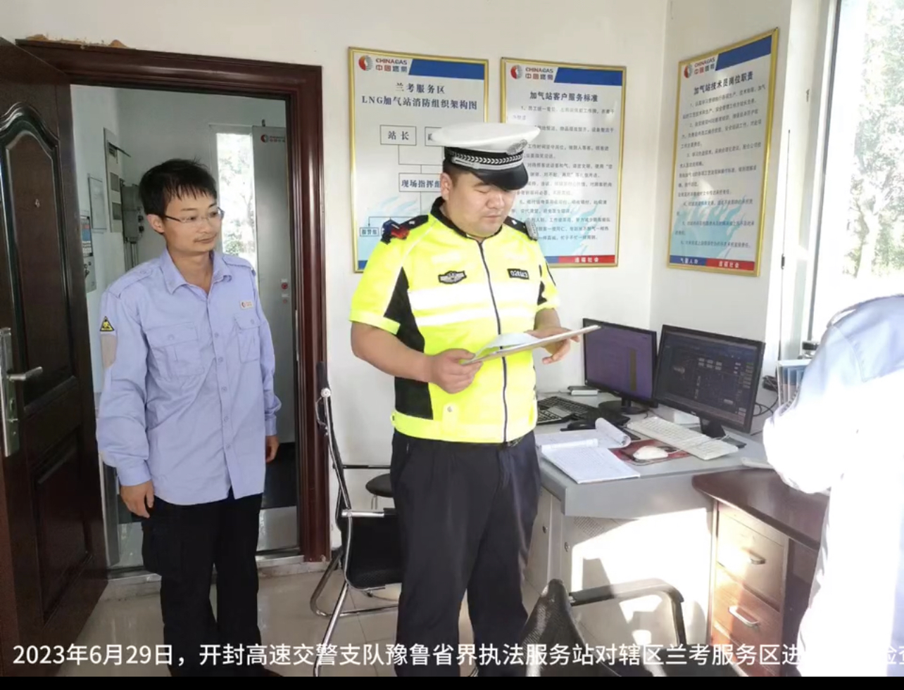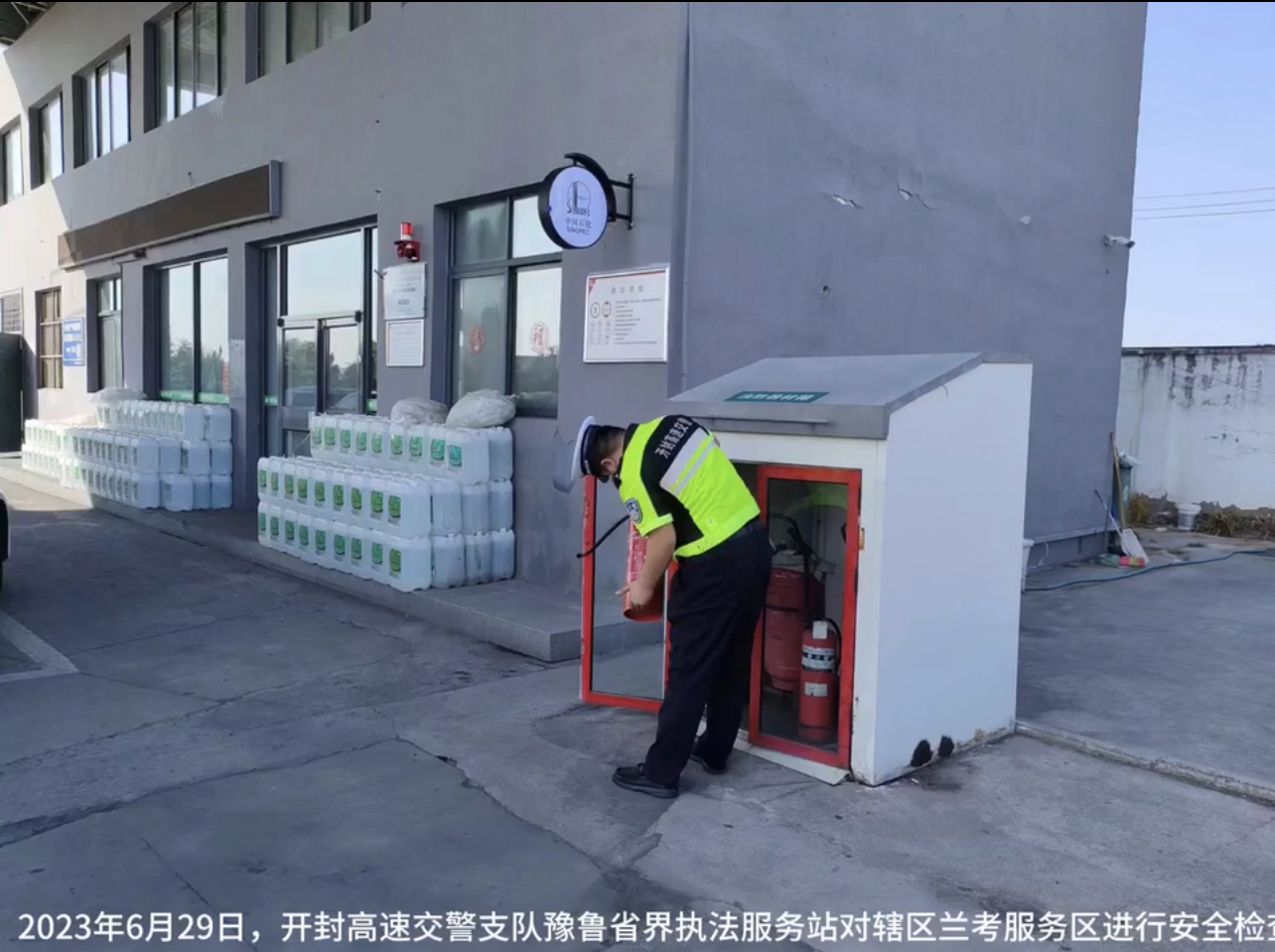 2023年6月29日下午,开封高速交警支队省界执法服务站民警尤永刚带领辅警常春光、李亚鹏深入日兰高速兰考服务区例行检查。