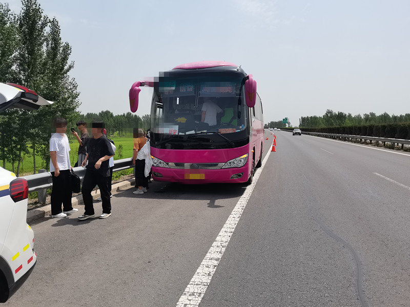 2024年6月25日上午11时许,郑州交警高速二支队三大队副大队长李艳飞、民警王勇、辅警李付彪,在辖区商登高速由东向西巡逻至139公里+900米处时,发现一辆长途大巴车停靠在应急车道内,司乘人员站立在车辆后方,不知所措,左右为难。执勤民辅警迅速停好警车,立即设置安全防护区。