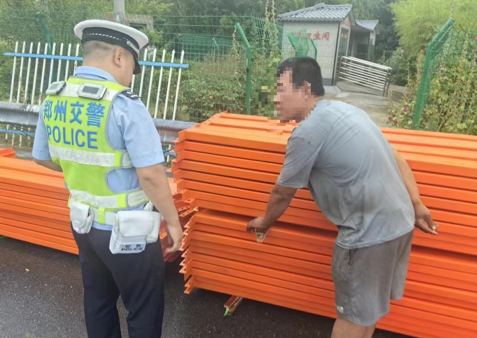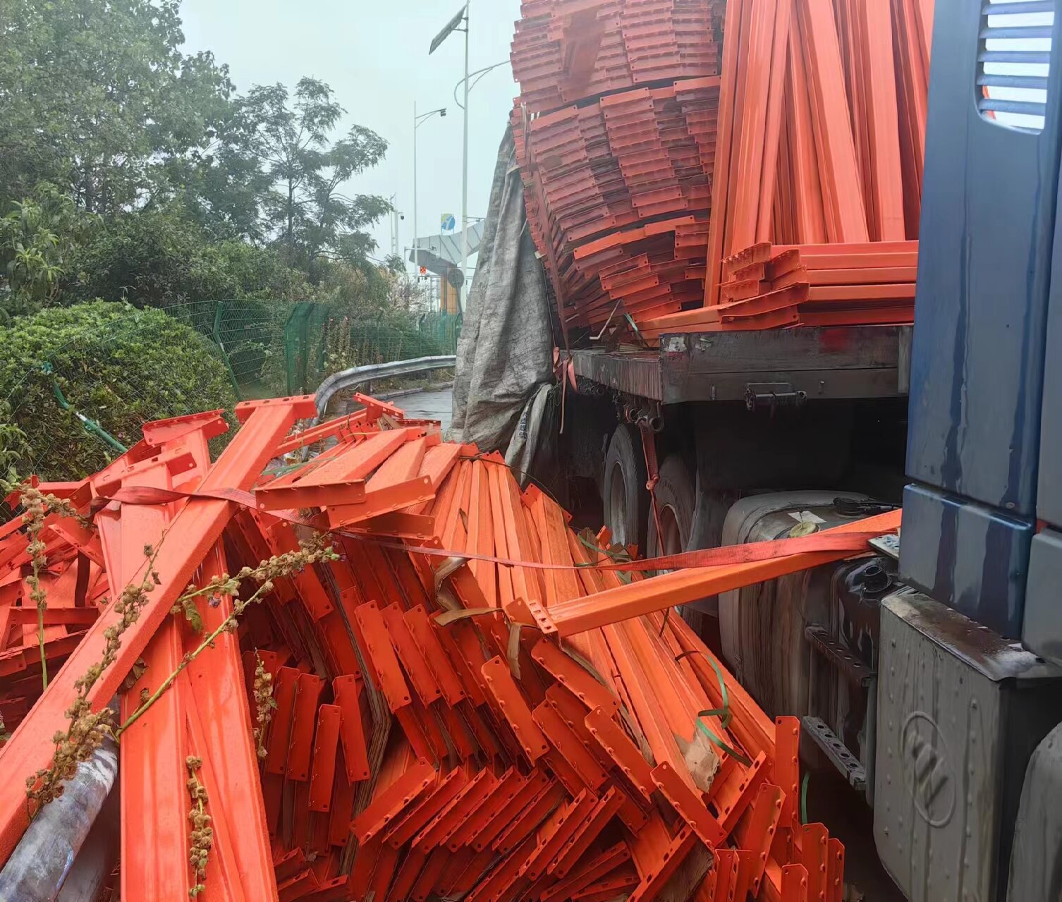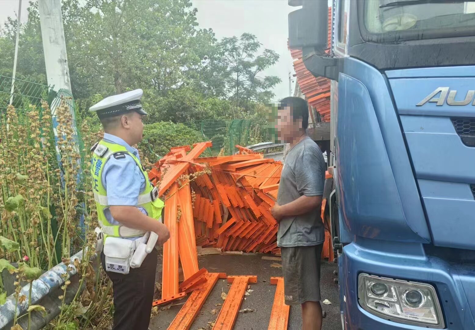 2024年7月1日15时许,一辆运载铁架的鲁Q半挂车,正准备从郑民高速姚家收费站上站时,被收费站工作人员拦下并告知驾驶人刘某:货物倾斜不能上高速。刘某下车发现车上货物向右倾斜,于是调头回去,预备调整好了再上站,刚转移到边上,正要查看什么原因时,货就倒向了旁边的护栏。又因货物太重,一人无法将货物重新安置。