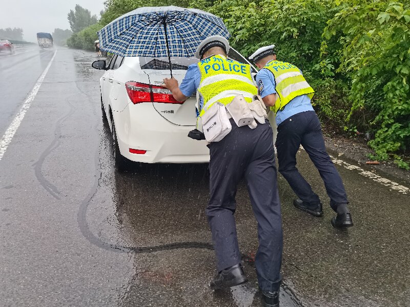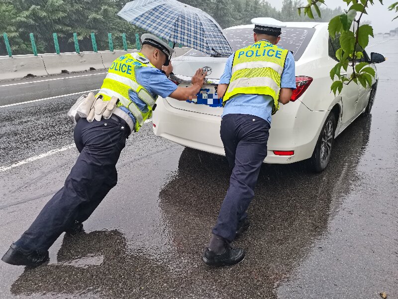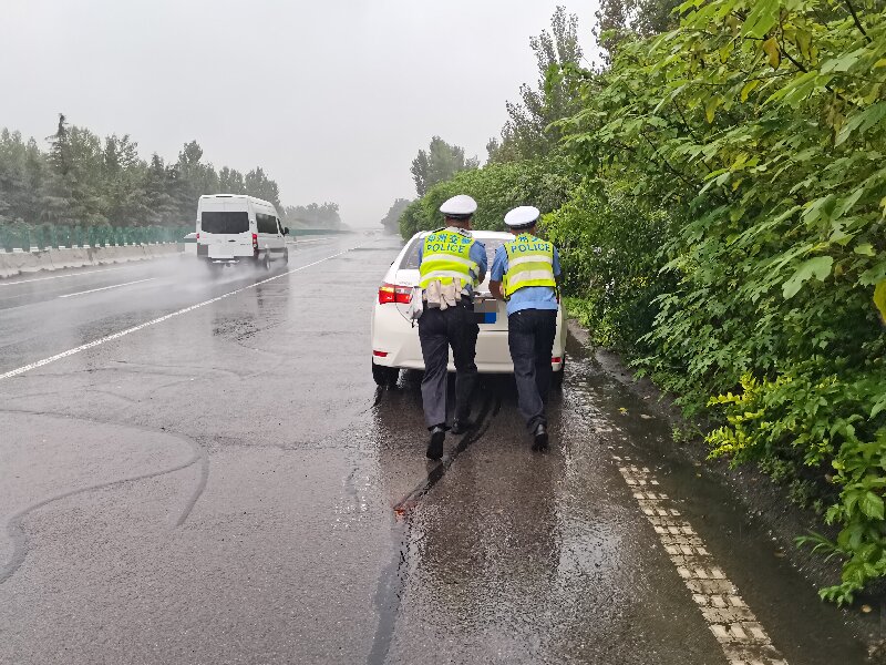 郑州交警高速二支队二大队教导员付珂带领执勤民辅警冒着大雨,迅速赶到现场。他们不顾雨大路滑,湿透衣服,将刘某的车辆推到紧急停车港湾内,及时消除了安全隐患,保障了过往车辆和群众的安全,用实际行动诠释了“为人民服务”的宗旨。