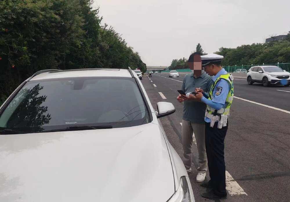 副大队长张迎军首先示意驾驶员靠边停车,表明身份后向其求证了车辆占用应急车道行驶的行为,当事人表示的确违法了,愿意接受处罚。