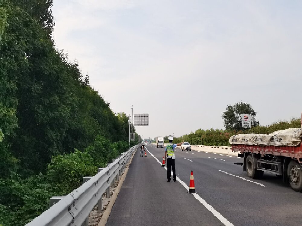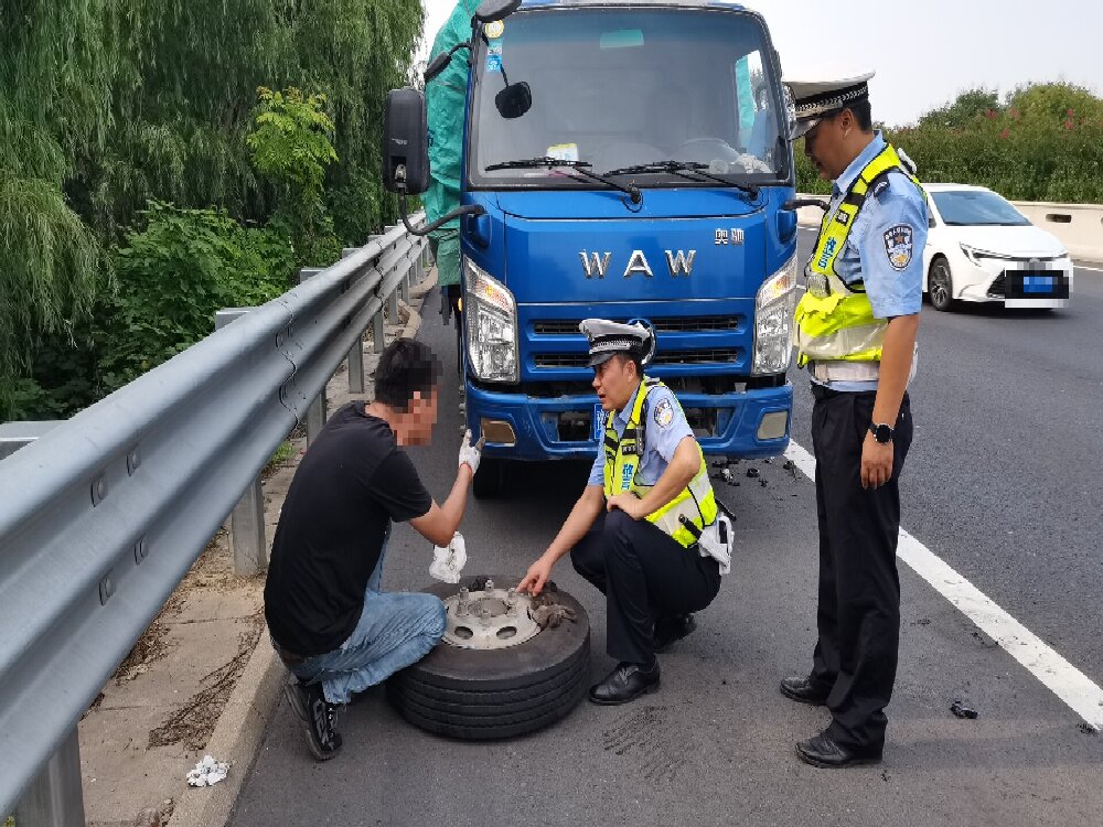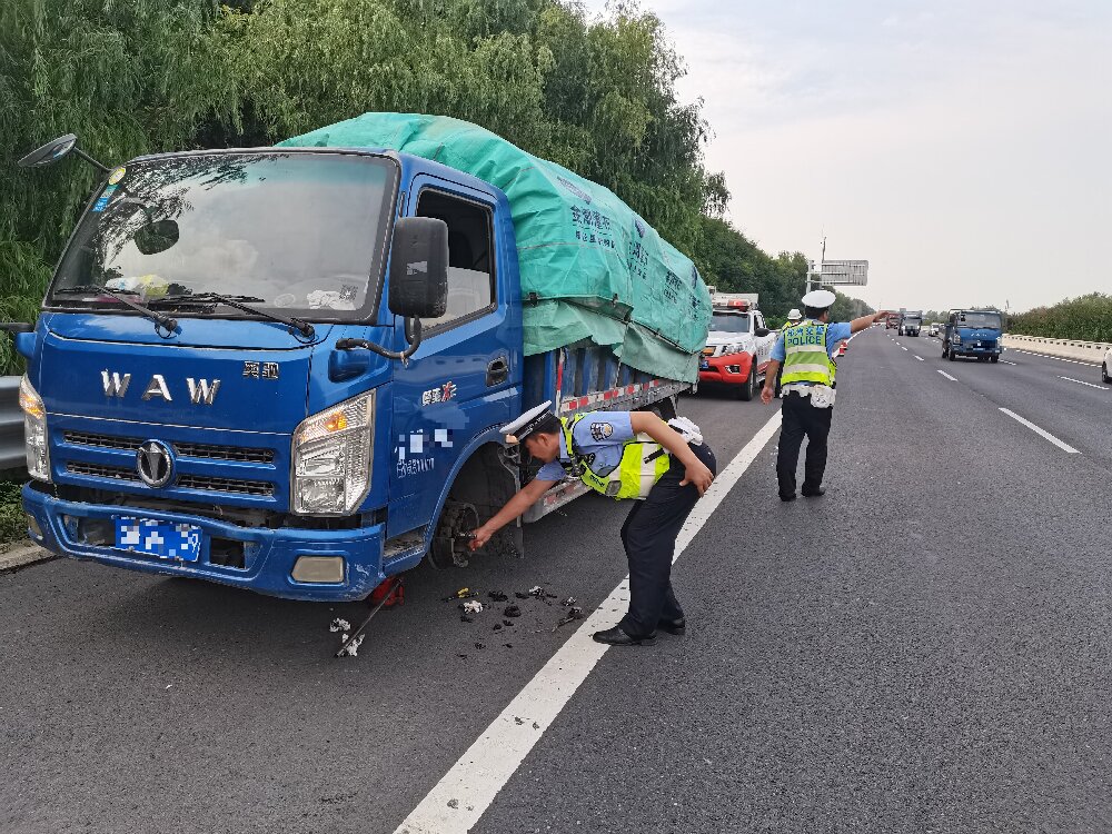 随着气温升高,高速公路上行驶的车辆爆胎和车辆高温等故障多发。2024年7月31日上午,郑州交警高速二支队事故大队教导员李锐带队巡逻中发现,在郑州郑民高速8公里处一辆蓝牌载满货物的小货车因车辆爆胎和轴承损坏停在应急车道内。后方的警示标志反光锥桶摆放距离太近,有极大的安全隐患。