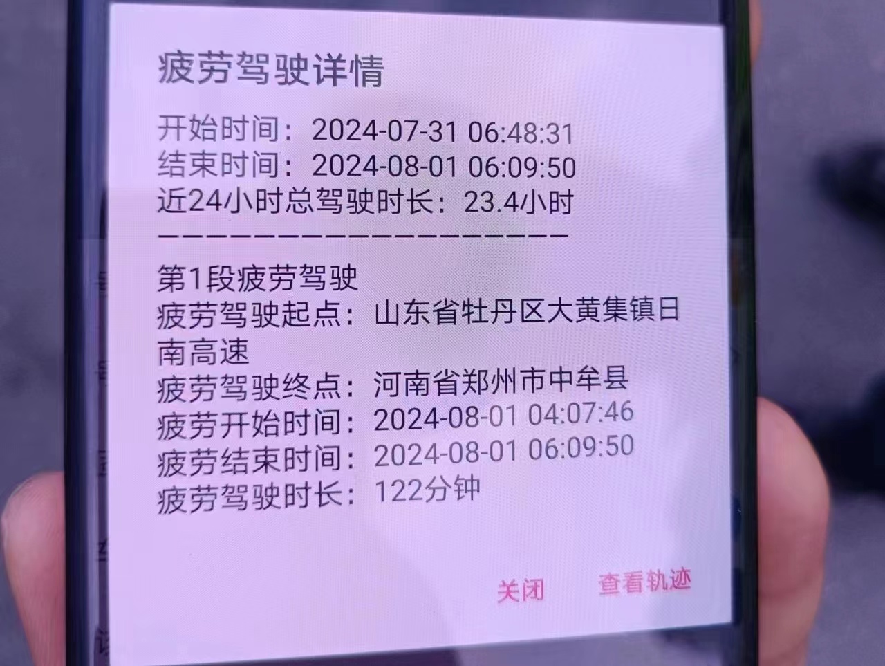 2024年8月1日上午,郑州交警高速二支队三大队大队长张琛义带领民辅警在郑民高速郑庵收费站执勤时,通过智能设备发现一辆车牌号为鲁A牌照的重型半挂牵引车驾驶员疲劳驾驶,车辆靠边停车接受检查时发现,该驾驶员双眼布满血丝,反应明显迟缓,通过设备记录显示,已经连续行驶远超4个小时。