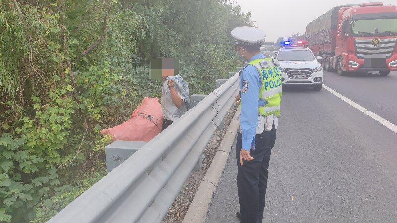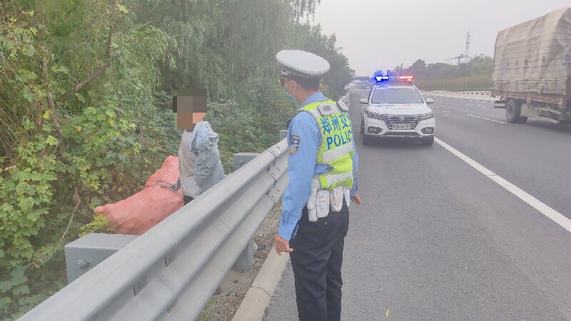 2024年10月9日15时45分许,郑州交警高速二支队四大队副大队长张迎军带队在郑州绕城高速巡逻,当行至西向东32公里+300米附近时,发现前方应急车道上有一个行人,有很大安全隐患。安全停车后,副大队长张迎军迅速下车,询问当事人情况。
