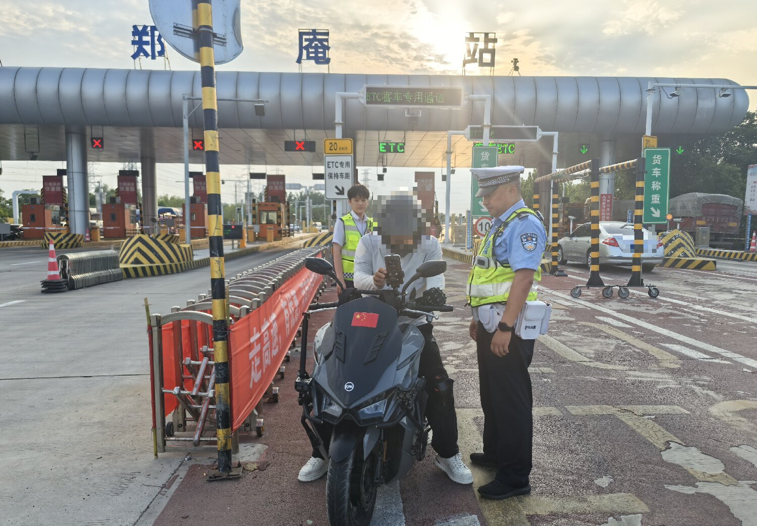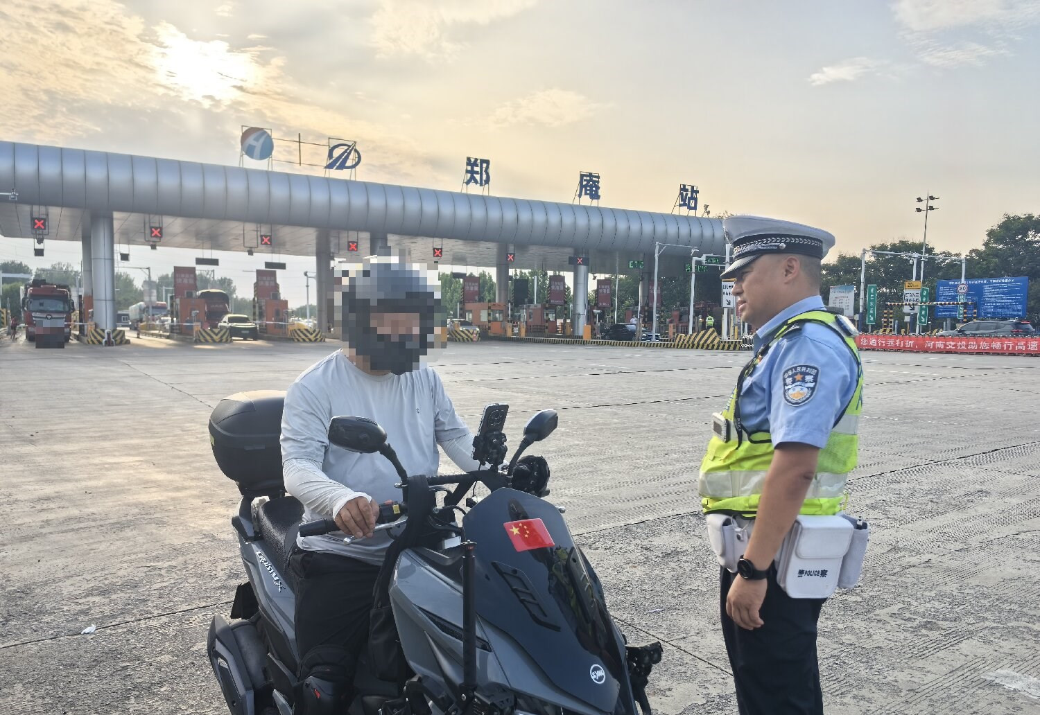 2025年7月26日,郑州交警高速二支队一大队副大队长陈洪涛带队在郑民高速郑庵收费站日常执勤时,发现一辆摩托车试图驶入高速公路。民警迅速上前,指示摩托车司机靠边停车,并按照规定对司机的证件进行了例行检查。