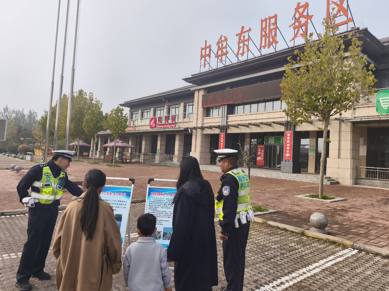为了加大道路交通安全宣传力度,提高人民群众交通安全意识和风险防范能力,2025年10月26日上午,郑州交警高速二支队三大队大队长张磊带队来到安罗高速中牟东服务区,就地开展道路交通安全宣传活动。