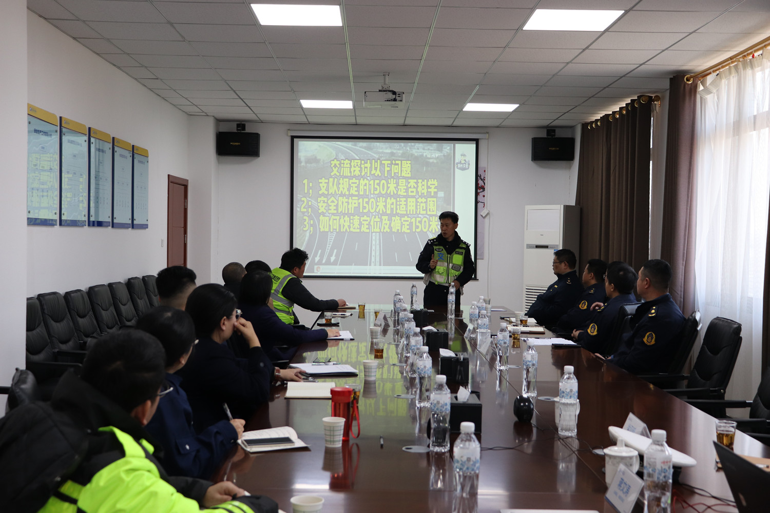 另一位民警则聚焦冬季安全防护和紧急情况下的安全防护设置,重点讲解了低温雨雪冰冻天气下的执勤执法规范、事故现场安全警戒区设置、警示标志摆放标准以及人员站位要求。民警特别指出,在冬季恶劣天气中,桥梁、隧道和匝道等路段易结冰,必须提前做好安全警示和防滑措施。同时还结合近期执勤中发现的风险隐患,提出了优化建议,如规范使用反光锥桶、加强夜间照明设备配备等,进一步提升了运营人员的安全防护能力。